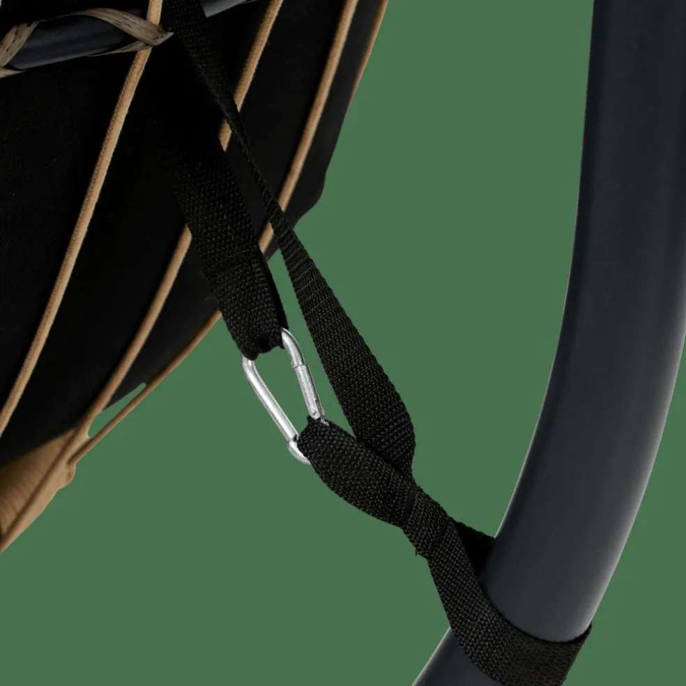 - Structure acier, Laque en poudre noir, 1,8mm diamètre, Corde, naturel, 6mm diamètre, Coussin, Polyester filé, noir