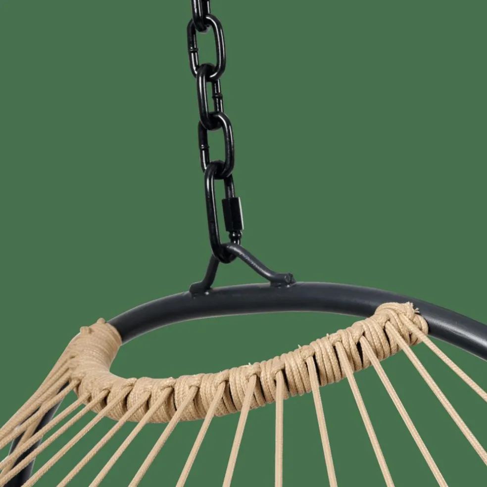 - Structure acier, Laque en poudre noir, 1,8mm diamètre, Corde, naturel, 6mm diamètre, Coussin, Polyester filé, noir